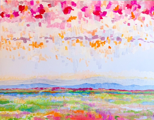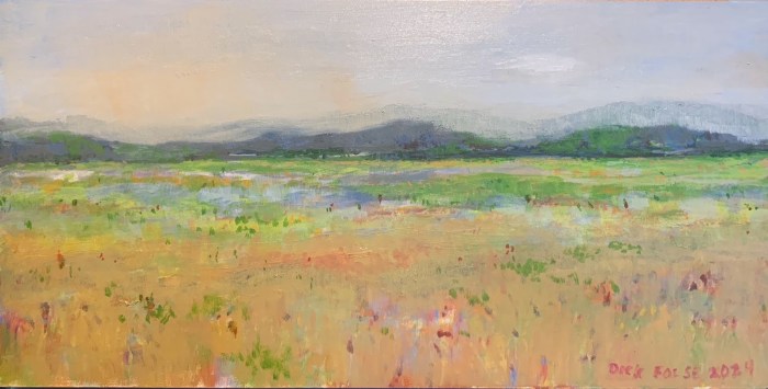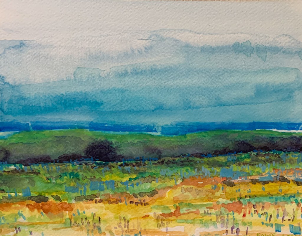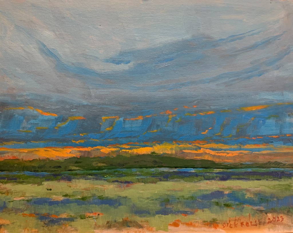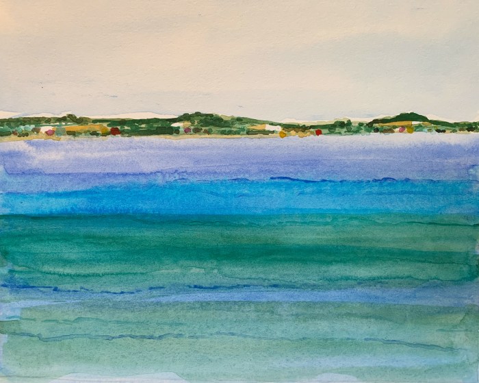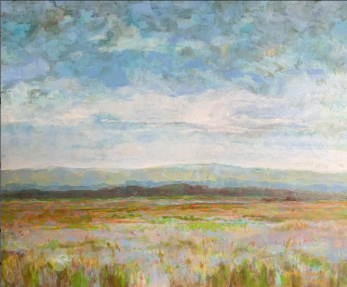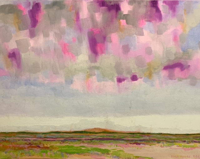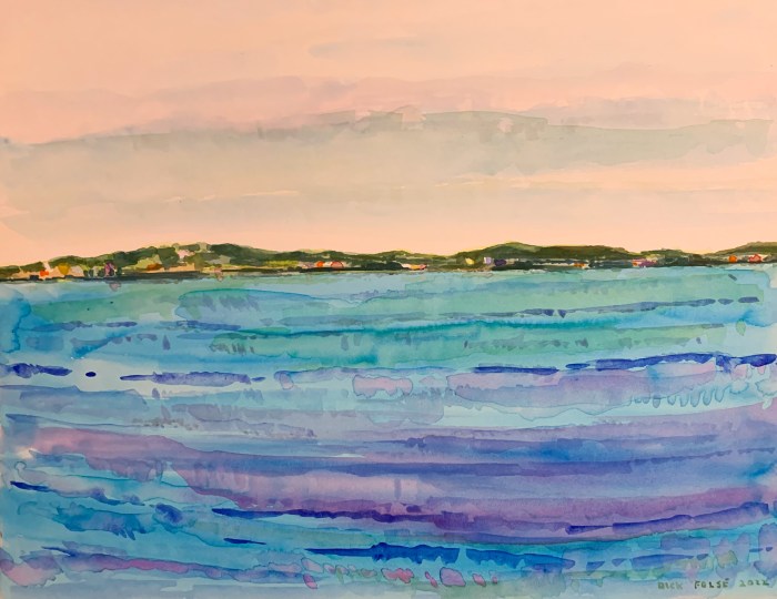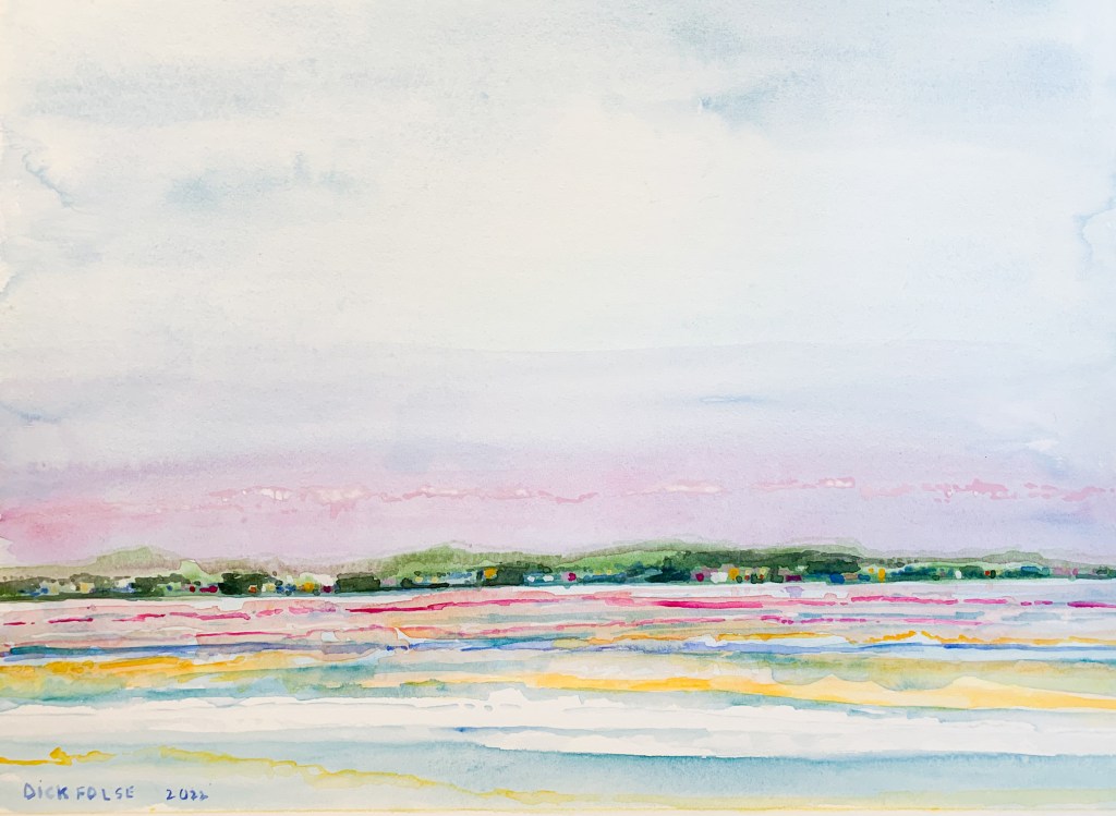 These paintings are an intersection of figuration and color that evoke a strong sensation – driving an instinctual interpretation of moments of changes in weather, time of day, and season. The paintings are not a literal transcription or documentation of the land, water, and sky around me; plein air painting and transcription are not part of my work. The paintings are made in the studio without direct reference to imagery, but through a sense of knowing a place.