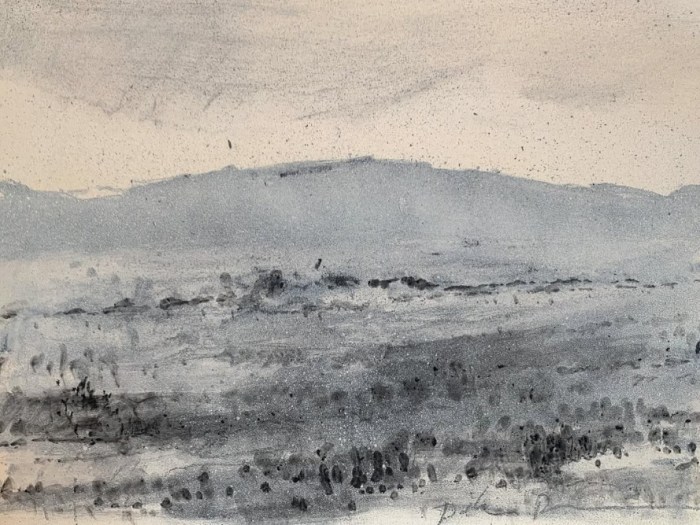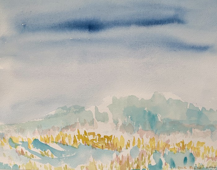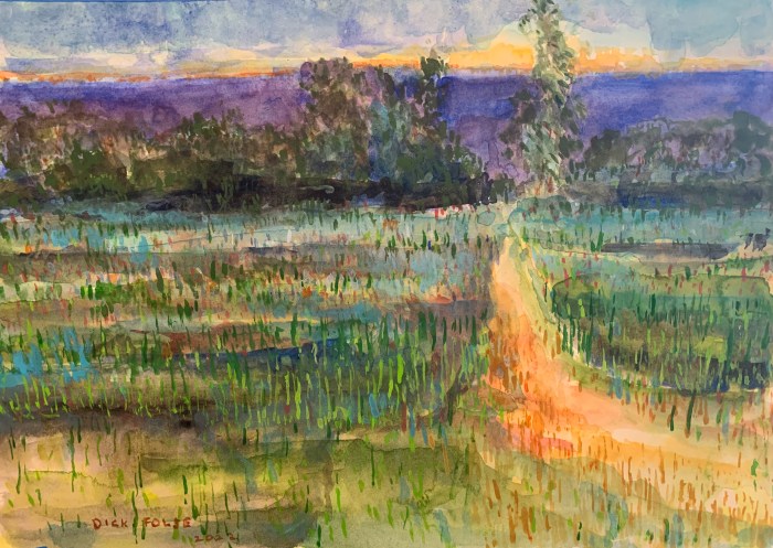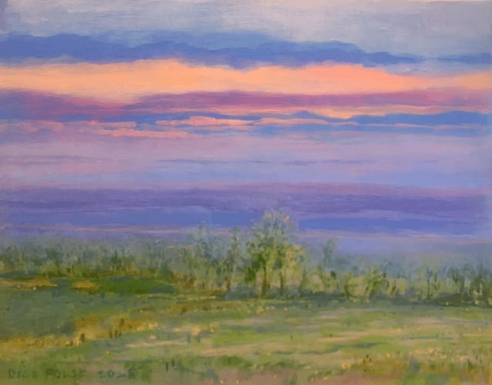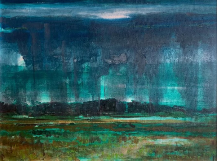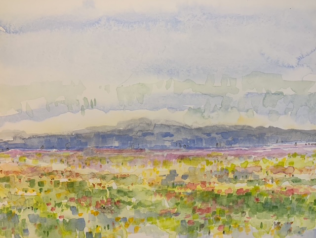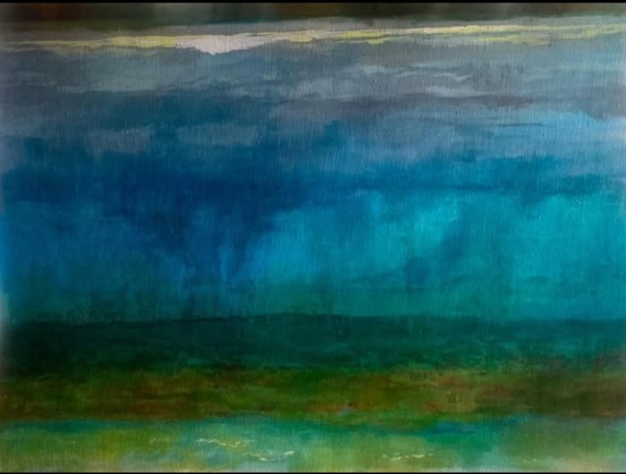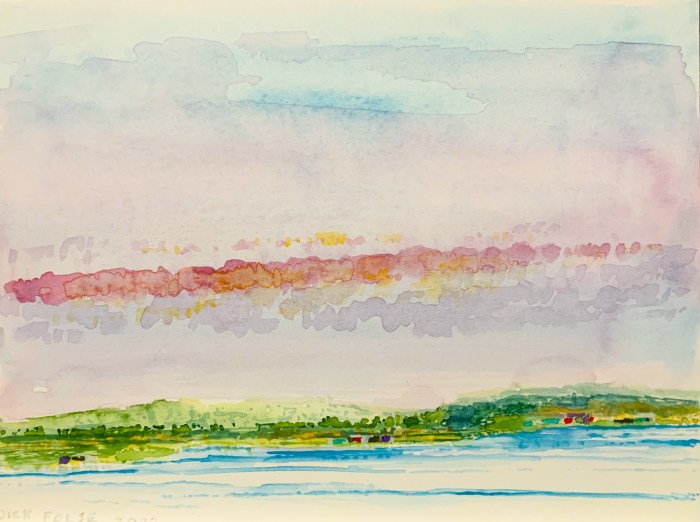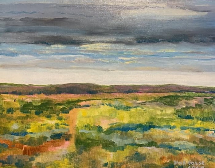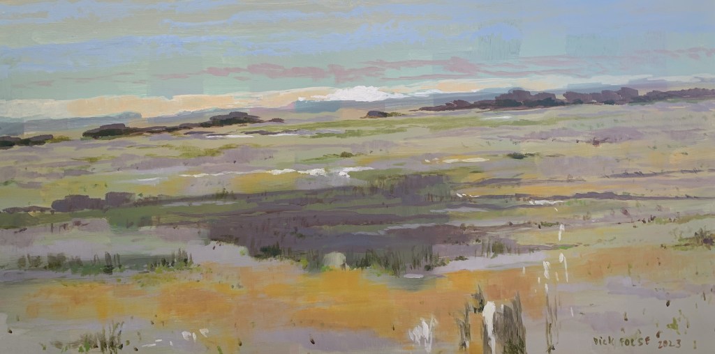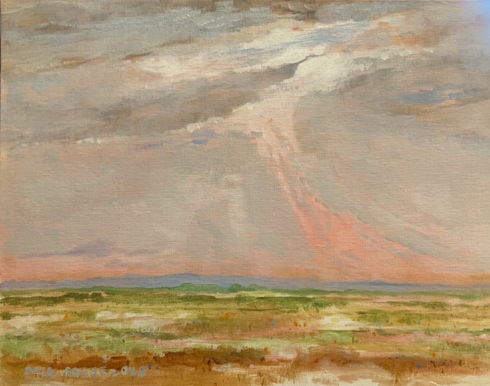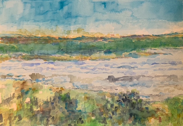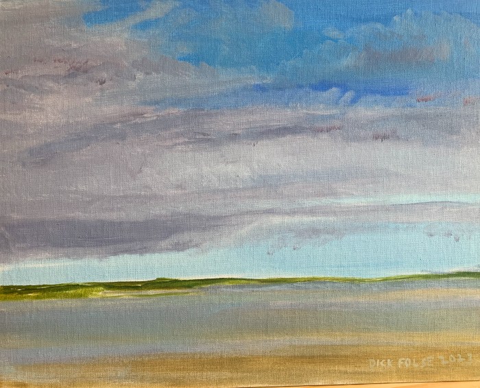 These paintings are an intersection of figuration and color that evoke a strong sensation – driving an instinctual interpretation of moments of changes in weather, time of day, and season. The paintings are not a literal transcription or documentation of the land, water, and sky around me; plein air painting and transcription are not part of my work. The paintings are made in the studio without direct reference to imagery, but through a sense of knowing a place.