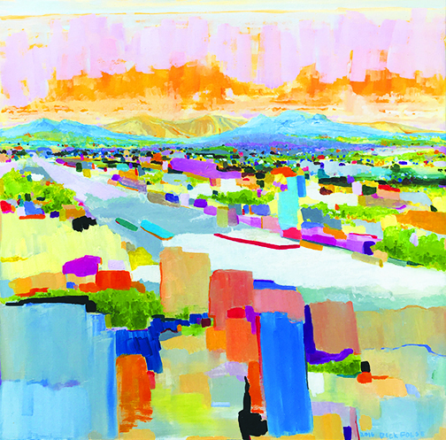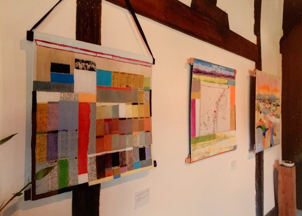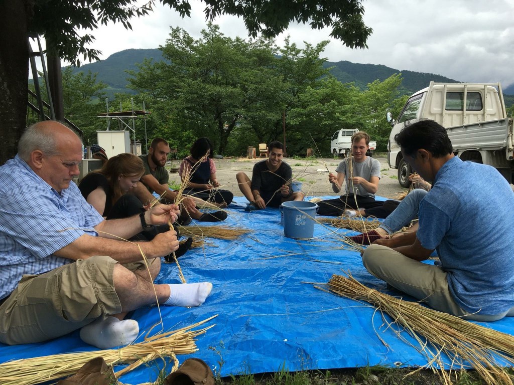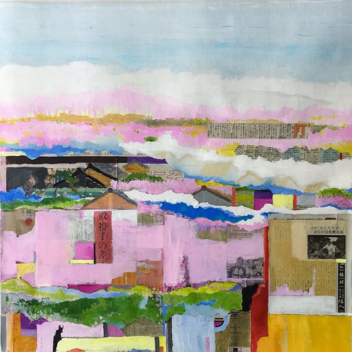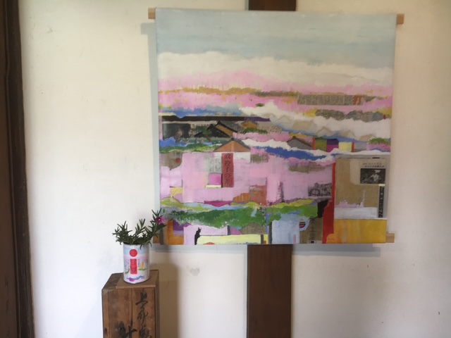 The opportunity allowed me to paint full time, engage with other professional artists, and immerse myself in the local culture and history. The compression of space utilization in the town was of great interest to me – a family might have a traditional, elegant house with immaculately manicured landscaping and a business recycling yard adjacent to the house. The textures and colors combined in small spaces to cause visual vertical stacking of elements. I began oil paintings by adhering regional newspapers to linen canvas and using the right-to-left reading blocks and strong vertical rectangles to influence and guide the painting’s composition. During the residency, I became friends with local townspeople, enjoyed regional cuisine specialties, participated in workshops and fieldtrips (e.g., making sandals from rice stalks, meditating at a Buddhist temple, visiting a traditional Japanese cabinetmaker, singing karaoke, preparing sushi with a master chef, and participating in the community music festival). Shiro Oni had a group art exhibition of residency members that was well attended by art patrons and reported in the newspapers.