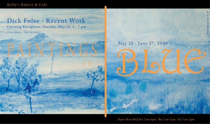 Paintings in Blue May 26 – June 27, 2009, Opening Reception: Tuesday, May 26, 5 – 7 pm Kelly’s Bakery and Cafe, Bloomington, Illinois Share this: Click to share on X (Opens in new window) X Click to share on Facebook (Opens in new window) Facebook Like Loading...